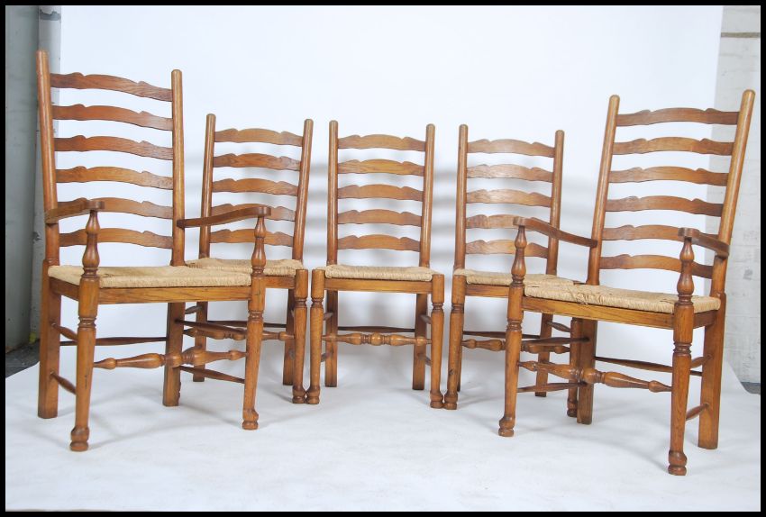 A set of 5 Brights of Nettlebed antique style rattan weave ladderback dining chairs. Each raised on turned legs with rattan seats with railed ladder back rests to each 114x58x56cms
