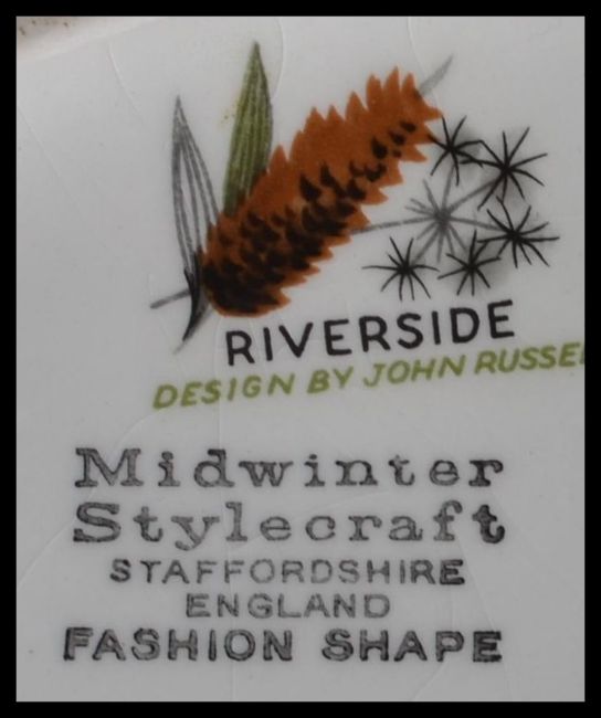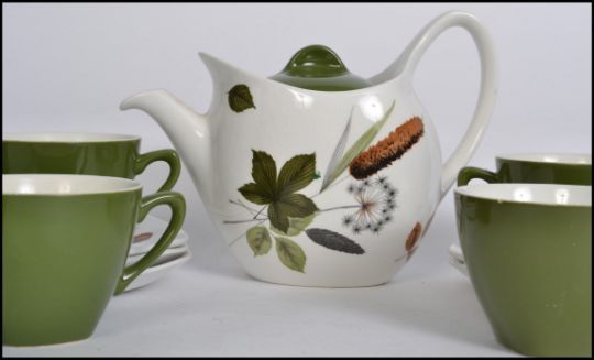 A retro 20th century Midwinter Style Craft 6 person tea service consisting of 6 cups and saucers, teapot and sugar bowl. Stamped to base.Measures:  17cm high.