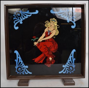 A vintage 1930s Art Deco table top discretionary screen having a painted glass panel with maiden to centre in the manner of Alphonse Mucha.