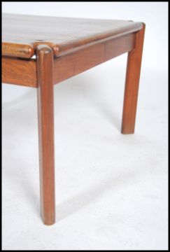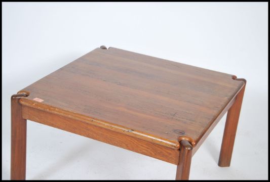 A 1970's Tarn Stole Danish teak wood coffee table of square form being raised on chamfered edge corner supports, the table being marked to the base