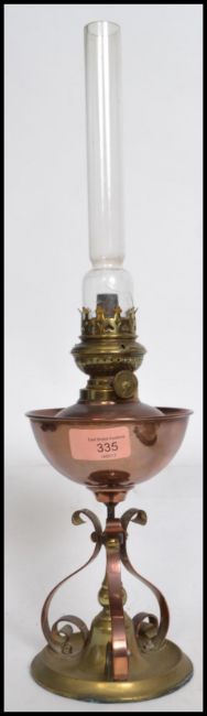 A early 20th century Arts and Craft movement copper and brass oil lamp having a scroll work tripod base with rise and fall burner stamped for WW Germany. Measures: 45cm high.