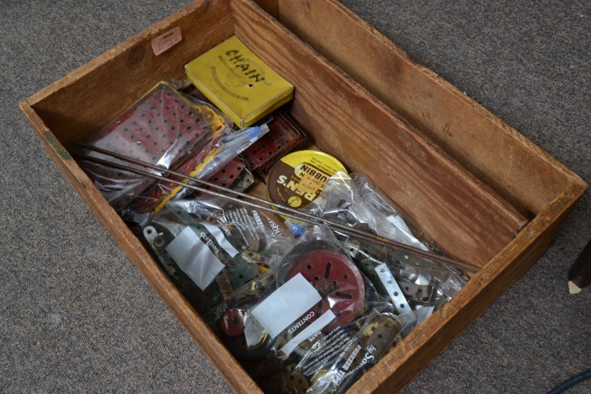 A collection of vintage mid 20th century Meccano set / pieces contain within a vintage wooden advertising box.