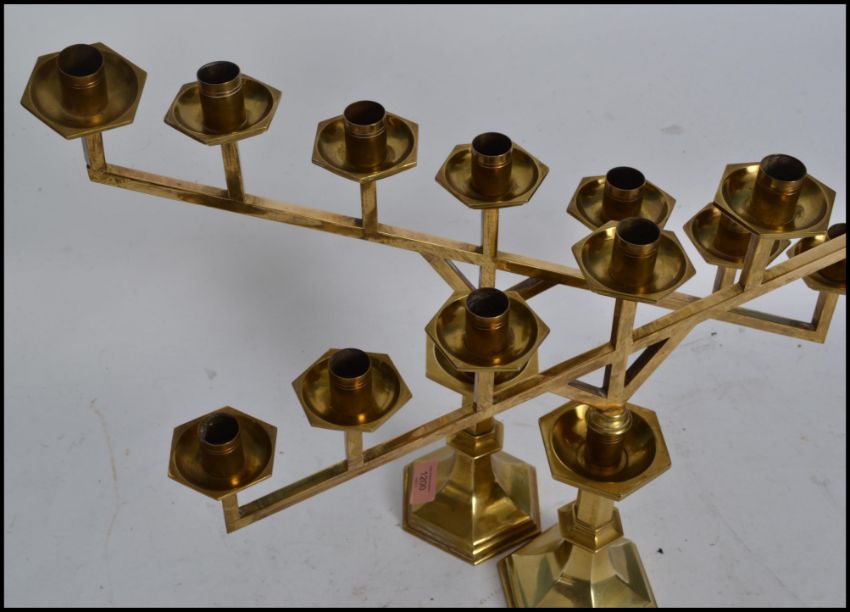A fantastic pair of 20th century polished brass Menorahs / of angular form raised on hexagonal terraced bases with 7 sconce branch atop.