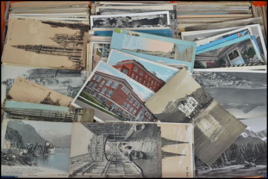 Overseas unsorted postcards (approx 3,000) in banana box. All early older foreign views.