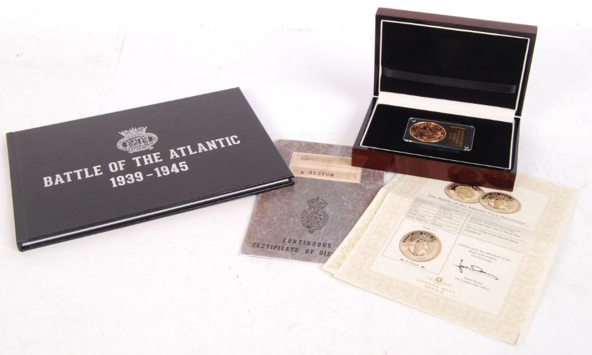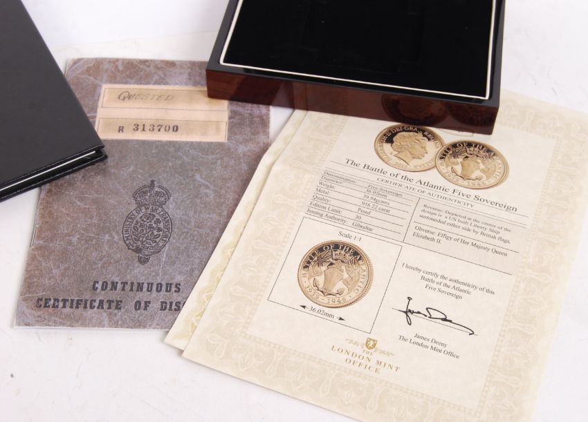 A London Mint Office issued ' The Battle Of The Atlantic Five Sovereign ' 22ct gold proof sovereign coin. Within its presentation box, with certificate, slipcase and accompanying book. Limited edition, struck by Captain John Sail No.26/30. 39.94g.
