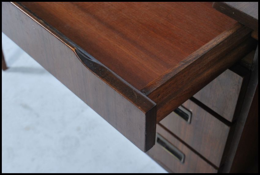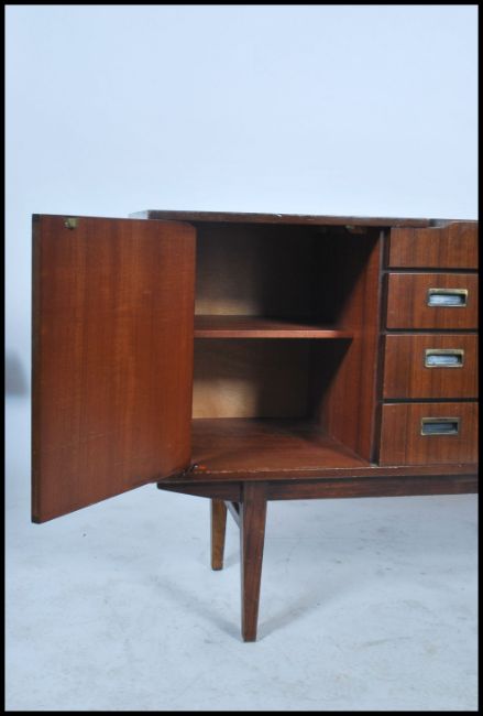 A 1970's teak wood sideboard by Beautility being raised on tapered legs having a bank of drawers with cupboards. All having recessed lozenge shaped handles