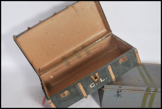 A mid 20th century canvas and wooden bound steamer trunk chest belonging to William Gerard Leigh of the 1st Life Guards. Together with a grey metal military campaign trunk still bearing a military label marked for W Gerard Leigh. The canvas bound trunk with label for his daughter Emily Gerard Leigh ( calne school )  ( J Gerard Leighs larger military campaign trunk in lot 1419 ) William Gerard Leigh whose significant career as also a Life Guard soldier and interestingly married Jean Gerard Leigh ( the latter trunk her daughters for Calne School), famous for being the the woman whose photograph was used to help trick the Germans into falling for one of the greatest deceptions of the Second World War in Operation Mincemeat. Operation Mincemeat, which was to inspire a film called The Man Who Never Was in the 1950s, was devised in the spring of 1943 by two intelligence officers, Charles Cholmondeley of MI5 and Commander Ewen Montagu of Naval Intelligence. With Churchill planning to invade Italy through Sicily, a ruse was required to make the Germans believe that the attack would take place elsewhere.