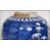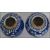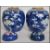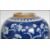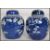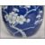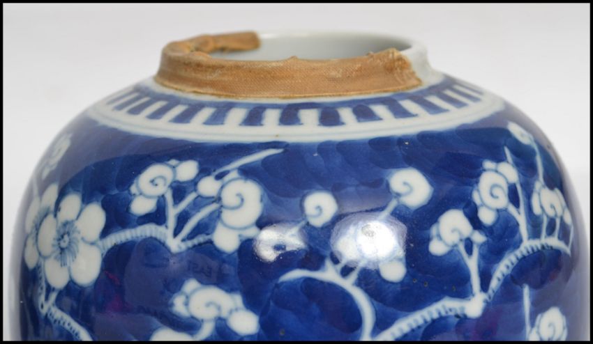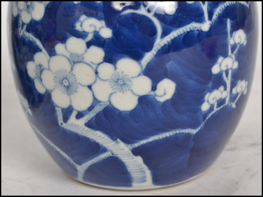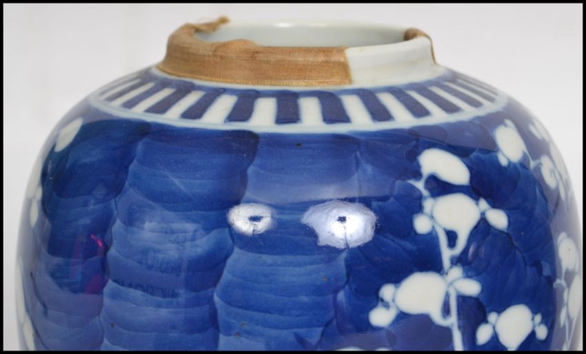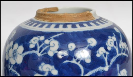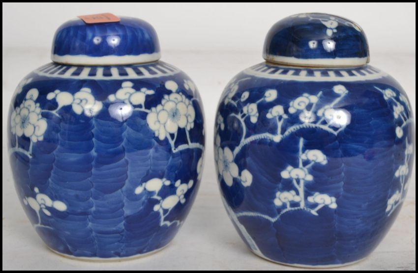 A pair of Oriental 19th century Kangxi ceramic blue and white ginger jars with lids decorated in a prunus pattern with double concentric blue circles to base.   Condition is good to one, repaired to the lid of the other, 15cms high