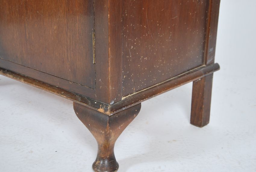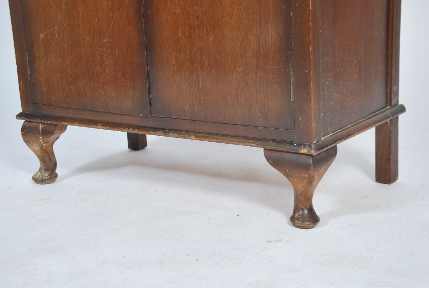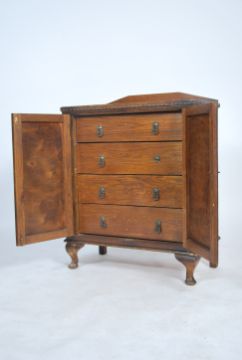 A 1930's oak estate cabinet chest of drawers. The cabinet with twin doors housing a series of drawers within. Raised on shaped legs with flared top and gallery back 100x77x43cm