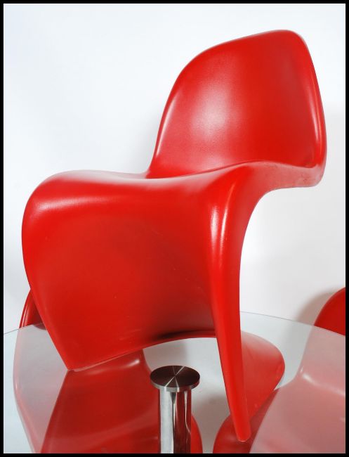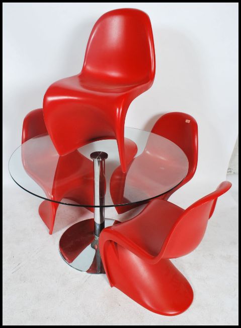 A set of 4 20th century Verner Panton style S-Chairs by Dwell in red together with a good circular glass and chrome dining table. The chairs being stamped to the underside. Measures 73cm high x 110cm across.
