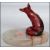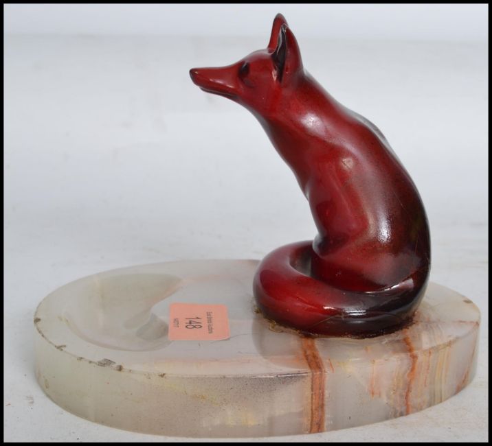 An early 20th century Royal Doulton ceramic flambe fox in a seated position in the famous flambe red glaze mounted on an onyx plinth base. Measures: 17cm wide.