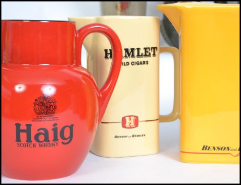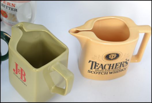 A collection of vintage and retro 20th century ceramic advertising water jugs with jugs having notation for Courage, Teachers, Haig, McKenzie, Canadian Club, Tavern Kee Brewery, J & B Whisky, White and McKay, Charles Kinloch and others. Measures:  23cm high.