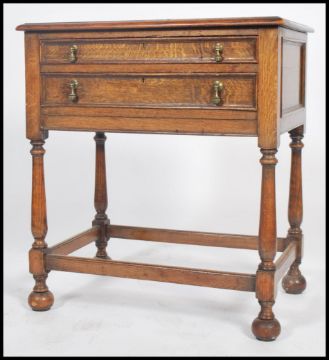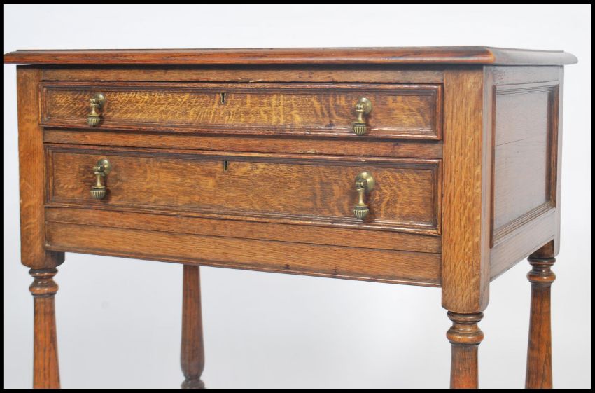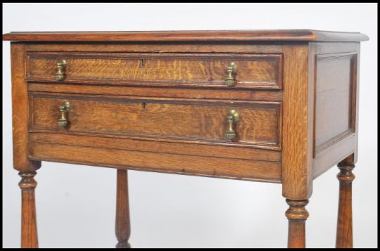 A 1920's oak barley twist canteen cutlery table / side table being raised on barleytwist supports united by stretchers having twin baize lined drawers with part cutlery service remaining 79x71x38cms