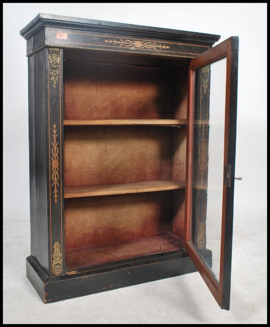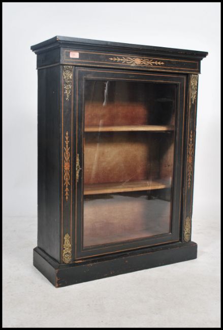 A Victorian ebonised and walnut pier cabinet,with satinwood stringing, single glazed door and ormolu mount 100x75x31cms