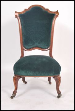 A good Victorian mahogany ladies armchair. Raised on cabriole reeded legs with a good deep turquoise velour overstuffed seat and back rest with show wood frame