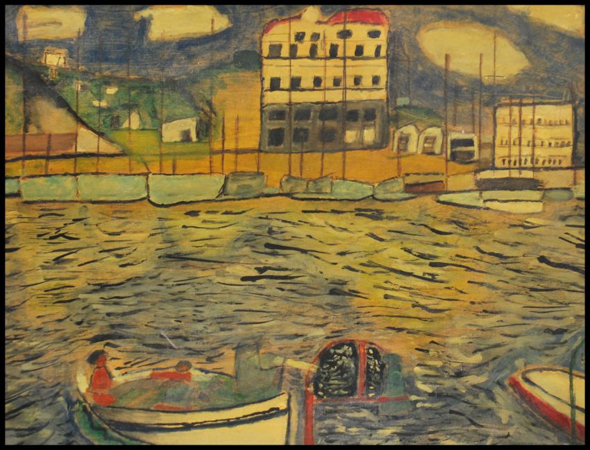 A framed retro 20th century 1960's naive abstract oil on board painting harbour scene study possibly a Bristol scene.