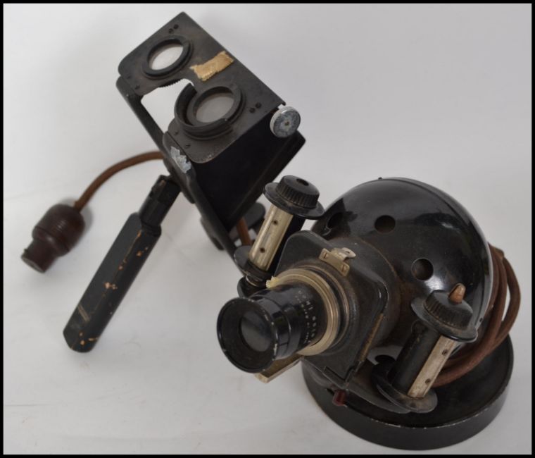 A vintage mid 20th century Zenit 35mm camera and lenses together with a vintage film viewer.