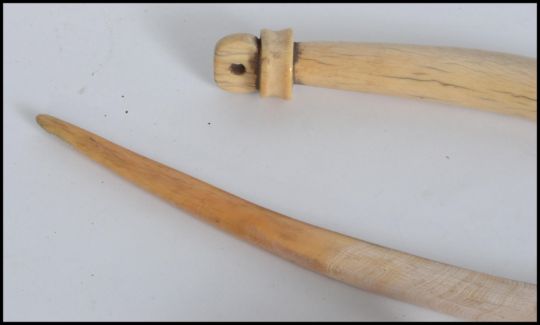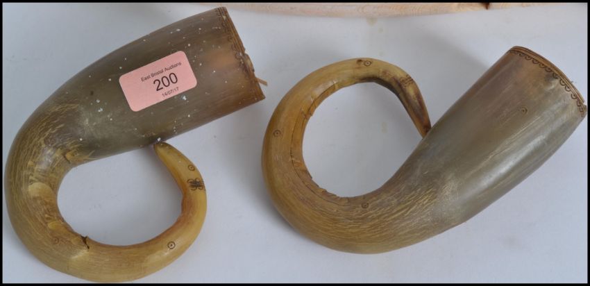 A pair of non matching 19th century worked Ivory tusks together with a pair of late 19th / early 20th century Anglo Indian toasting goats / rams horns having simple etched patterns. Measures: 54cm wide.