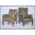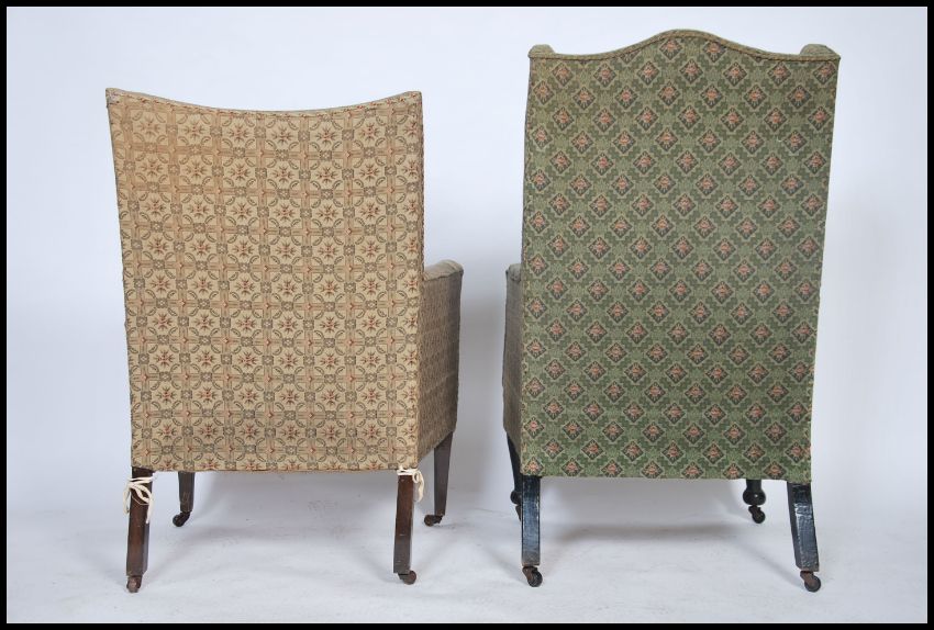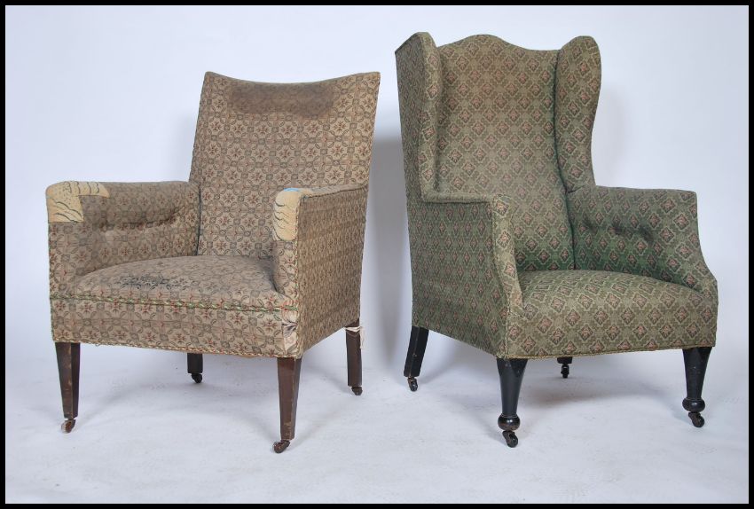 A Victorian wingback armchair being raised on turned legs with ceramic castors together with an Edwardian ladies armchair ( near matching ) being raised on tapering legs. Both upholstered in the same fabric. 109cms x61cms x65cms