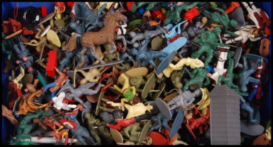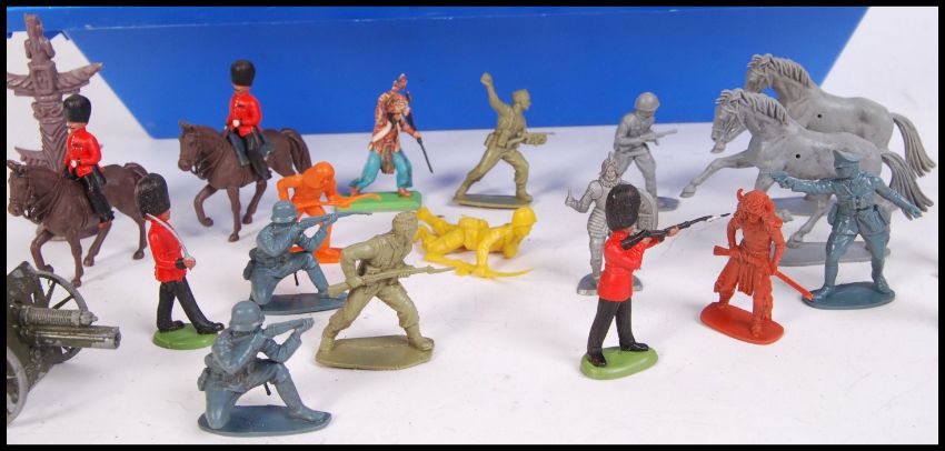 A collection of original vintage loose Timpo & Britains plastic & lead to include; British Soldiers, Wild West Cowboys & Native American Indians, World War officer, Modern style soldiers, horses etc.