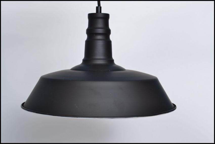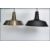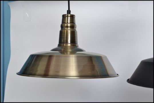 2 retro / vintage industrial style factory pendant of enamel metal in the UFO style. one with black and white colourway, the other spun copper effect
