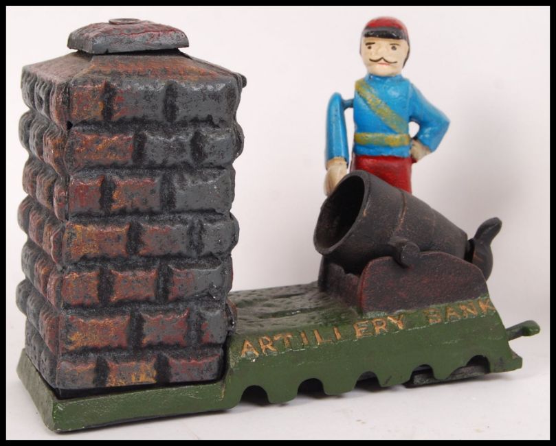 A collection of 2x 20th century vintage style cast iron money boxes to include; Michelin Man bank (approx 21cm tall) & 'Artillery Bank' (approx 19cm wide).