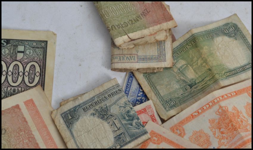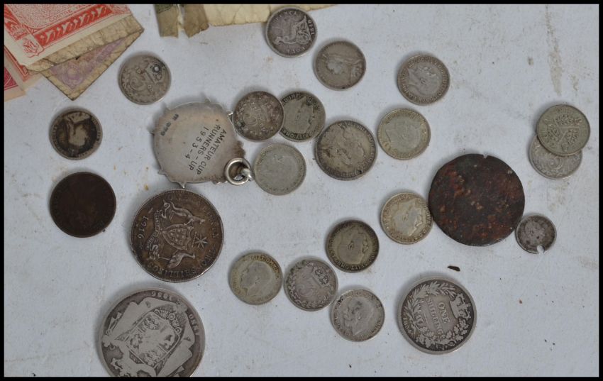 A good collection of Georgian and Victorian silver coins along with a silver hallmarked enamel football fob and a collection of vintage bank notes coins to include a William IV 1836 half crown, 1834 half shilling, Australian 1916 one florin, 16 silver three pence pieces, an 1834 one 1/2 coin. Measures:  13cm wide.