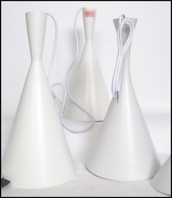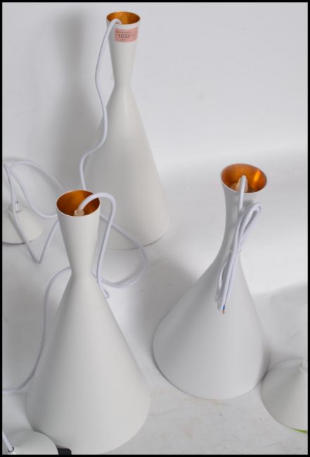 A set of three vintage retro style waisted pendant conical pendant ceiling lights after a Tom Dixon design, finished in white paint with a reflective gilt liner.