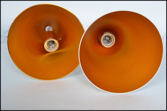 A pair of vintage retro style waisted pendant conical pendant ceiling lights after a Tom Dixon design, finished in white paint with a reflective gilt liner.