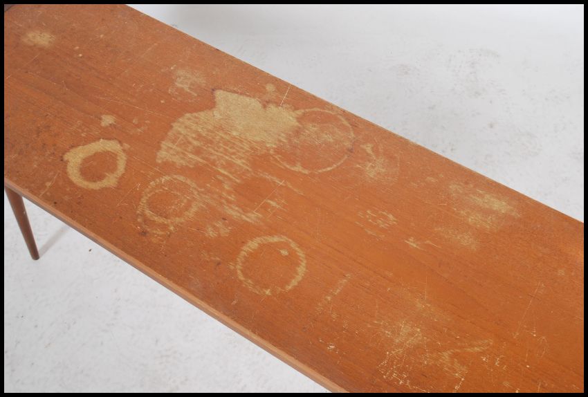A 1960's retro Danish influenced teak wood rectangular coffee occasional table, Raised on tapered legs. 41x118x38cm