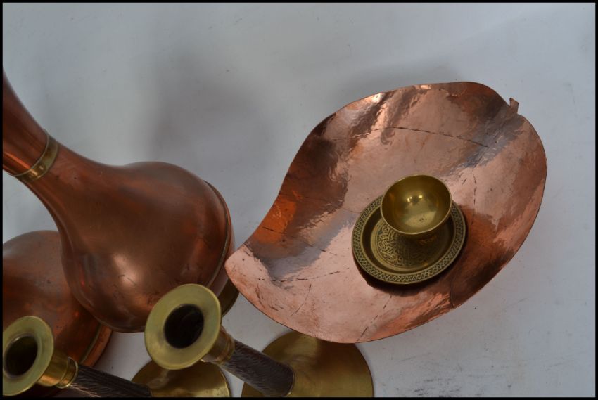 A collection of copper and brass metal wares to include an arts and crafts dish, plates, candlesticks some stamped DESCRIPTION NEEDS BUFFING. Measures: 38cm high.