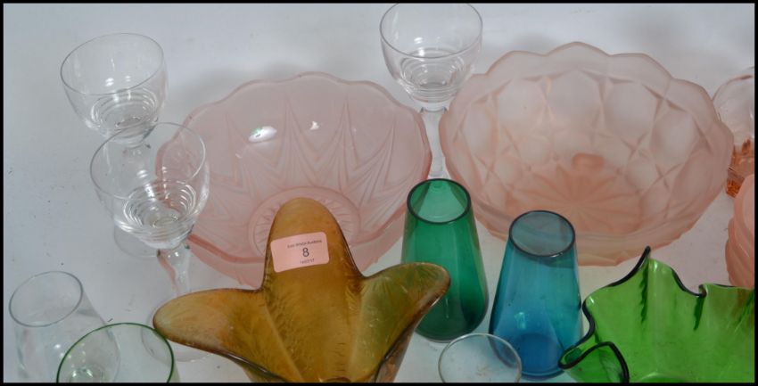 A large collection of studio art glass to include a peach glass dessert set, a set of six wine glasses having waisted rigged bowls, handkerchief vases, Riihimäki vases etc. Please see images. 23cm wide.