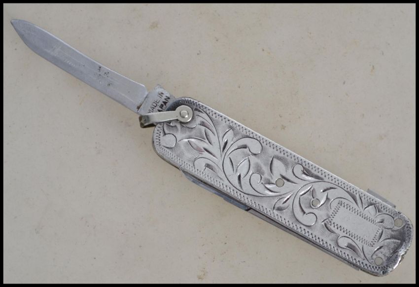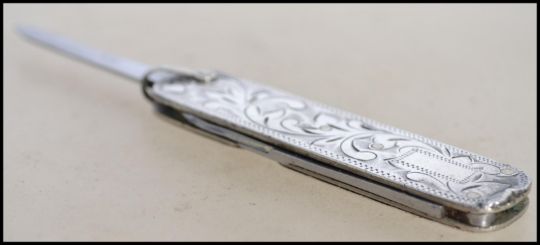 A sterling silver Japanese pen knife and scissors set having a rococo leaf swirl design. Weighs 29.2 grams measures 6.5cms long.