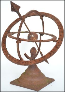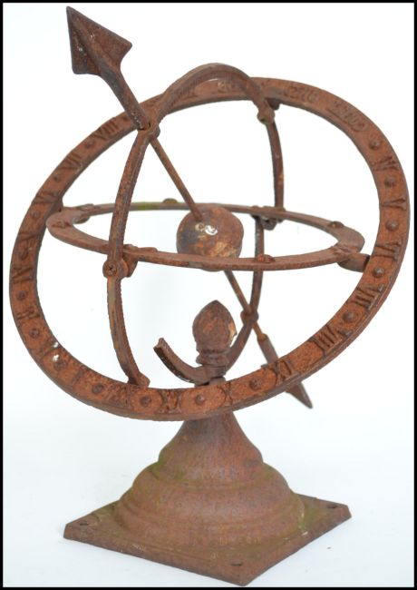 A vintage 20th century cast iron armillary sundial with central arrow and a Roman numeral chapter ring.