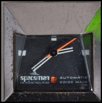 A gentleman`s 1970's retro chrome and stainless steel wristwatch by Avdacievse, Spaceman. Marked to rear of case 46617/7.  Black dial with square dot numerals, baton hands and date aperture at lower centre with Automatic Swiss movement all set to a stainless steel bracelet
