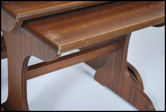 A retro 20th century vintage teak wood effect nest of tables by Valco having shaped legs united by stretchers. Measures 42cm high x 53cm wide x 41cm deep.