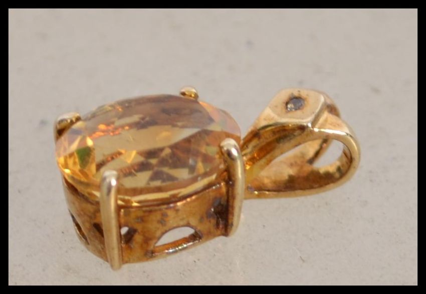 A hallmarked 9ct gold pendant set with a faceted citrine and white stone to twin bale. Weight 1.8g.