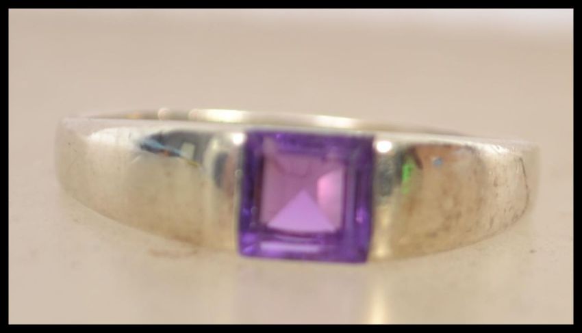 A hallmarked 9ct gold ring set with a contemporary central square cut amethyst. Hallmarked Birmingham. Size N, Weight 2.4g.