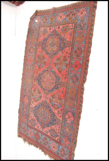 A large Turkish / Persian handwoven rug having red ground with blue spandrels and geometric black and blue borders elsewhere, tassled fringes to each end. Measures: 290 x 160.