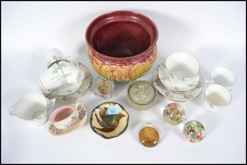 A good collection of ceramics and glassware to include paperweights, a part Deco tea service, Staffordshire planter etc please refer to images. Tallest measures 19cms high.