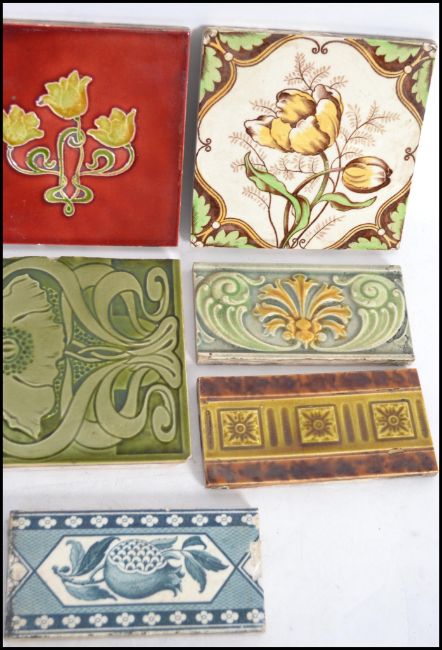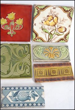 A group of 19th century Victorian tiles to include 5 square and 4 edging tiles in Art Nouveau and other styles.