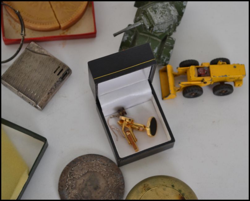 A  vintage trench barrel lighter together with a silver plated Maruman Halley lighter, brass travelling ashtray, Societe D'Agriculture De L'Allier medal, silver christening band, boxed D Luiz I medal by Jose Aurelio and a 1951 festival of Britain soap in box af