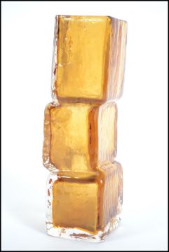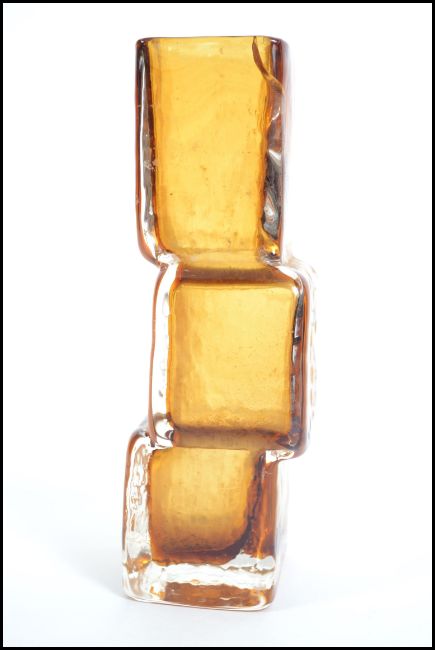 A Whitefriars style tangerine orange textured ' Drunken Bricklayer ' glass vase  in the manner of Geoffrey Baxter, 1969-74 Measures 21cms high