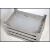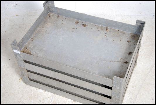 A set of four vintage industrial aluminium stacking tote trays, each with twin carry rails. Measures height 38cm x width 62cm x depth 42cm.