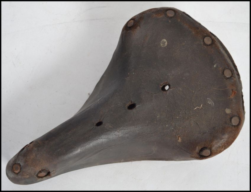 A vintage early 20th century Brooks leather bicycle seat having notation to side with spring work underneath.