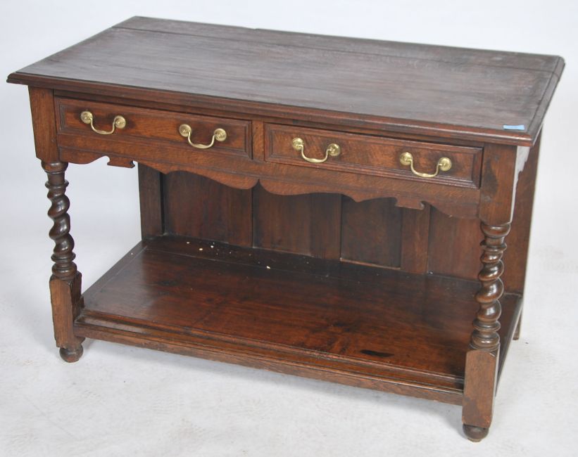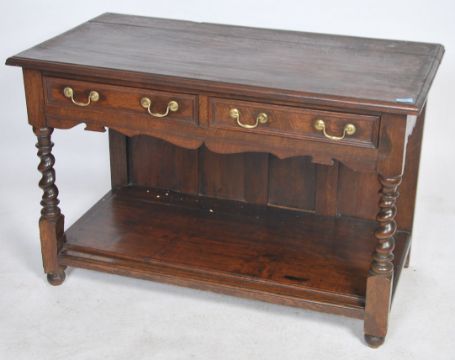 A Victorian  19th century Jacobean revival barleytwist side table desk having lower gallery shelf with twin drawers and flared top all supported by barley twist legs. Measures 74cm high x 114cm wide x 58cm deep