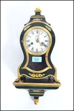A good French style lacquered mantel clock by Schmid. The 8 day movement striking on a ball with decorative case with glass pendulum window complete with key. Marked to rear with label. Also comes with the clock bracket shelf