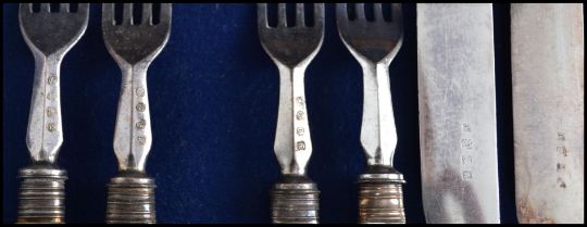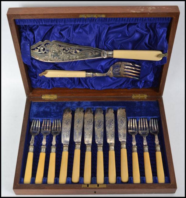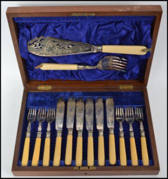 An Edwardian mahogany silver hallmarked collar cased fish serving knife and fork with matching 6 place knife and fork set by Cooper Bros, Sheffield. Together with another cased canteen of cutlery with mother of pearl handles, marked for JD&S possibly James DIxon & Sons
