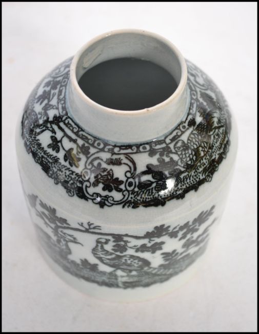A late 18th century black transfer printed tea caddy probably Staffordshire, the base bearing label for the Rowland Williams Collection