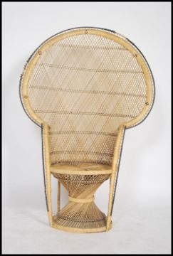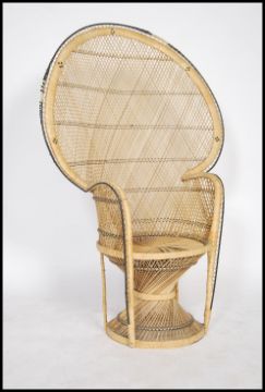 A vintage 20th century cane wicker rattan weave conservatory chair, having a peacock fan back with pierced arms and box base.
